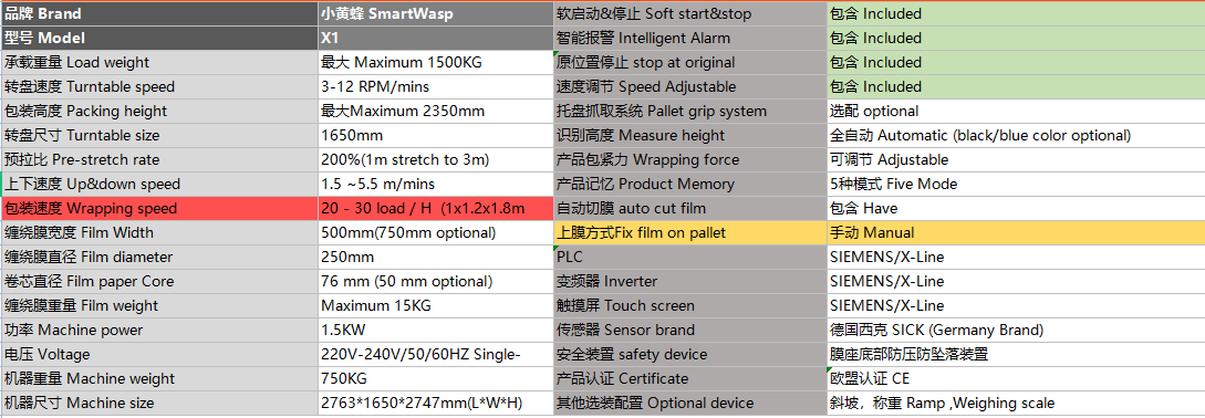 小黃蜂自動預拉式纏繞膜機X1,堆放在托盤上的貨物進行纏繞包裝,使被包裝物更加穩(wěn)固和整潔,