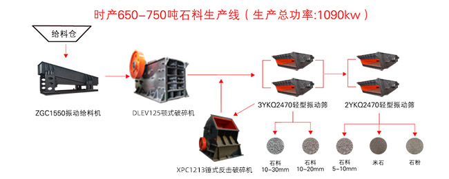 以常見的時(shí)產(chǎn)700左右顎式破碎機(jī)石料生產(chǎn)線配置舉例,工藝流程如上圖所示,大塊物料經(jīng)料倉連續(xù)、均勻的輸送到DLEV125顎式破碎機(jī)中進(jìn)行初級破碎,破碎后的一部分物料直接進(jìn)入篩分環(huán)節(jié),一部分物料輸送到XPC1213錘式反擊破碎機(jī)中細(xì)碎整形,而后進(jìn)入篩分環(huán)節(jié),篩分出來不符合成品料粒度要求的被返料帶返回二級破碎機(jī)再次加工,形成一個(gè)閉路循環(huán),設(shè)備配置可以根據(jù)項(xiàng)目實(shí)際需求靈活配置。
