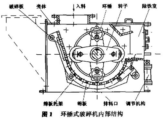 從以上KRC800環(huán)錘式破碎機結構圖我們看到,設備的主軸上安裝有數(shù)排掛錘體,在其圓周的銷孔上貫穿著銷軸,用銷軸將錘頭鉸接在各排掛錘體之間,錘頭磨損后可調換工作面。掛錘體上開有兩個銷孔。銷孔至回轉軸心的距離是不同的,可以用來調整錘頭和篦條之間的間隙。轉子兩段支撐在滾動軸承上,軸承有螺栓固定在機殼上。主軸和電動機用彈性聯(lián)軸器連接。