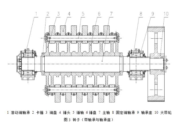 從上面轉(zhuǎn)子結(jié)構(gòu)示意圖我們看到,2018單段錘式破碎機共有24個錘頭,每排6個,共4排。