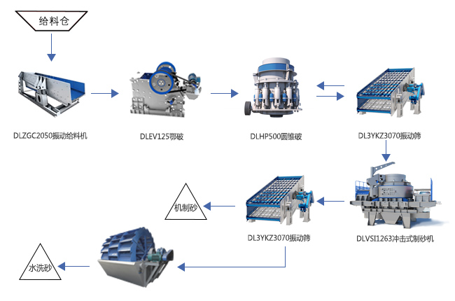 河卵石硬度較高,破碎環(huán)節(jié)可以選用鄂破+圓錐破兩段破碎工藝,制砂環(huán)節(jié)可用2臺沖擊式制砂機(jī),工藝流程為:河卵石原料經(jīng)振動給料機(jī)均勻輸送給顎式破碎機(jī)進(jìn)行粗碎,粗碎后的物料直接輸送到圓錐破進(jìn)行中碎,中碎后的物料再被輸送到2臺沖擊式制砂機(jī)進(jìn)行制砂。