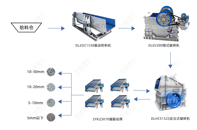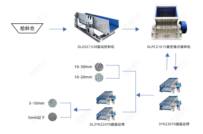 破碎環(huán)節(jié)只用一臺DLPCZ1615重型錘式破碎機,既用來做粗碎,也用來加工頭道篩的返料,取代傳統(tǒng)兩段破碎,較大程度上減少設備投資成本,頭道篩出10-30mm、10-20mm兩種成品料,二道篩出5-10mm、5mm以下石粉兩種成品料。