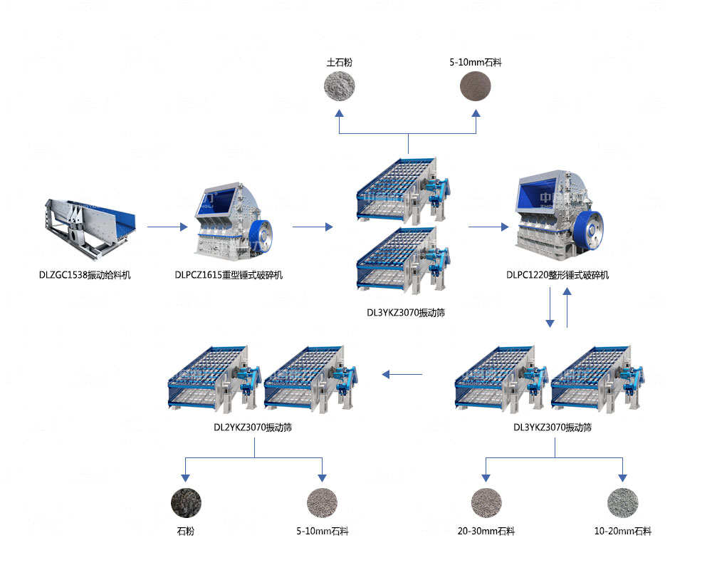 利用重錘破一次成型的性能優(yōu)勢,頭破直接出一部分5-10mm成品料,并經(jīng)過頭道篩篩分混料中的土石粉,提高成品料潔凈度,剩余物料經(jīng)過二次破碎后,先后進入兩道篩分,分別出20-30mm、10-20mm和5-10mm、石粉等成品料。