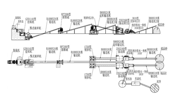 方案三:破碎環(huán)節(jié)選用顎破和圓錐破,可用來破碎高硬度物料,如果原料粒度在40mm以下,可以省去破碎環(huán)節(jié),直接用來制砂