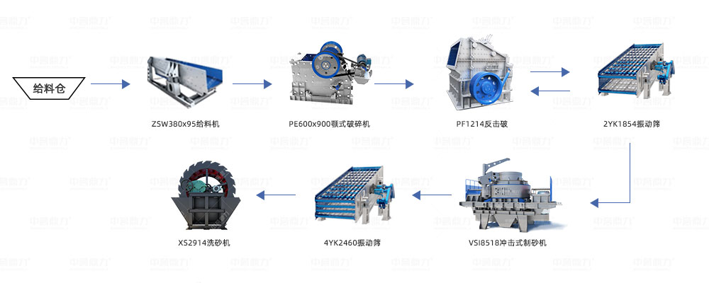 設備搭配:ZSW380x95給料機+PE600x900顎式破碎機+PF1214反擊破+4YK2460振動篩+VSI8518沖擊式制砂機+2YK1854振動篩+2914洗砂機;