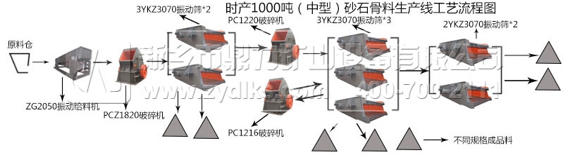 由一臺振動給料機均勻給料,進入破碎設備進行物料破碎,破碎物料接著進入振動篩進行篩分,不滿足粒度物料直接進入下破碎設備進行再次破碎?梢愿鶕(jù)成品料顆粒粒度的需求增加破碎設備和篩網(wǎng)不同孔徑的振動篩進行砂石生產(chǎn)線砂石物料的生產(chǎn)?梢钥闯龃藯l生產(chǎn)線生產(chǎn)物料為顆粒比較細小砂石料。