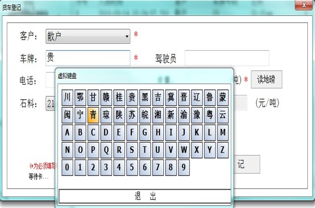 如上圖,當打開貨車登記的界面打開后,只需要在“車牌”的輸入框里點擊鼠標,就會彈出一個包含省份簡稱、字母和數(shù)字的虛擬鍵盤,操作員只需要用鼠標點擊需要的虛擬按鍵就可以了,免去了打字的煩惱,解決了用戶的電腦使用水平不高、打字慢的問題。