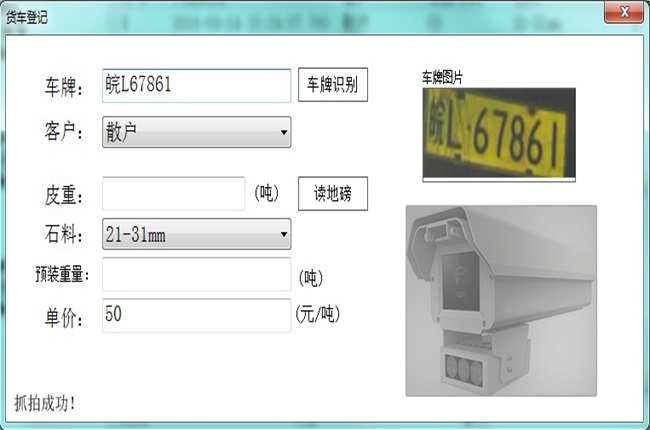如上圖,操作員點開“貨車登記”對話框后,車牌識別機自動開機抓拍識別,得到的圖片和車牌號都相應的顯示在對話框中。更加提高了車牌輸入的速度,真正體現(xiàn)了軟件操作簡便快捷的特點。
