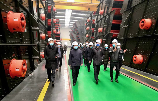 在中譽鼎力智能裝備公司廠區(qū),張治民董事長向各位導詳細匯報公司復工復產情況,并介紹中譽鼎力“五位一體”循環(huán)建材產業(yè)園及一體化智能生產車間。