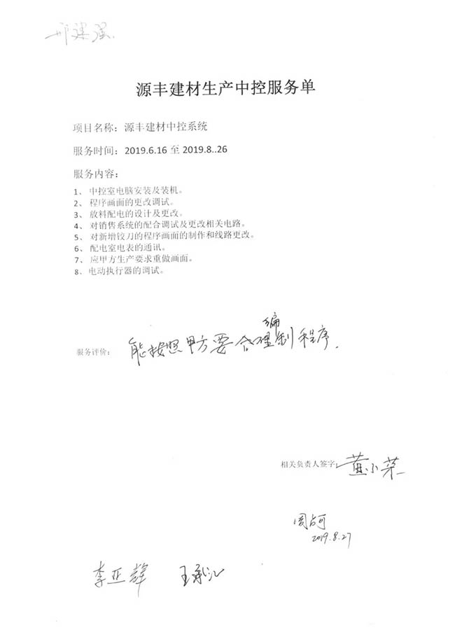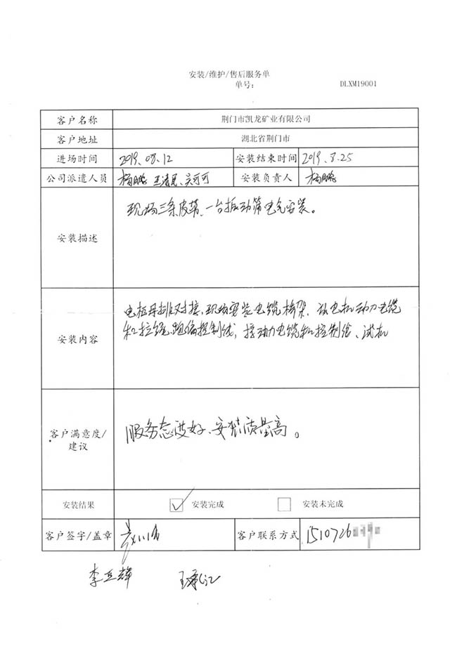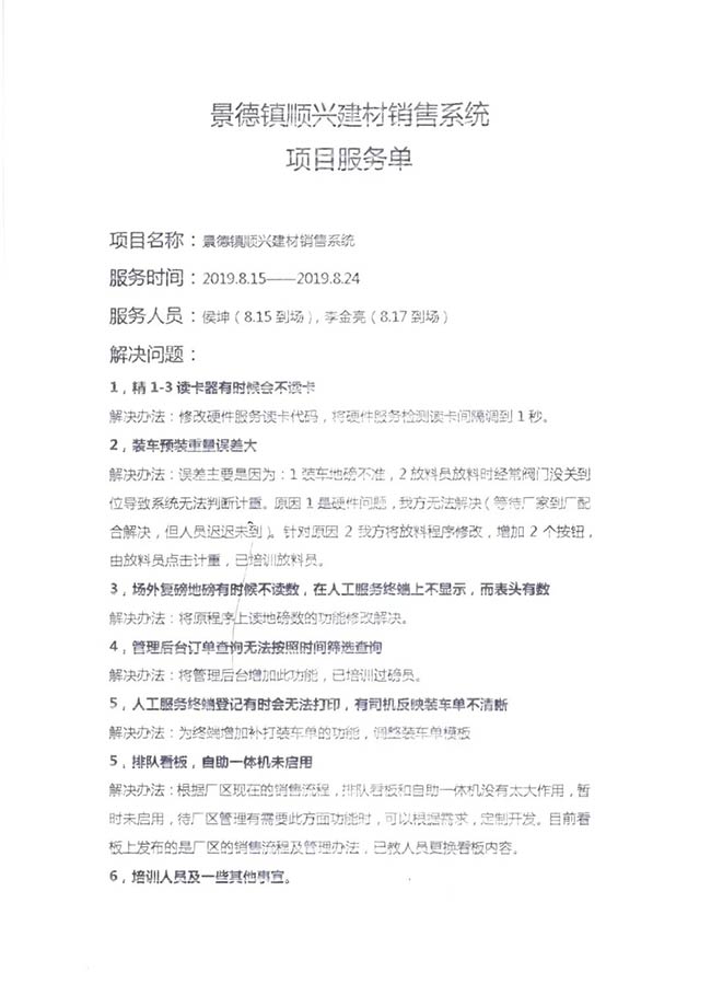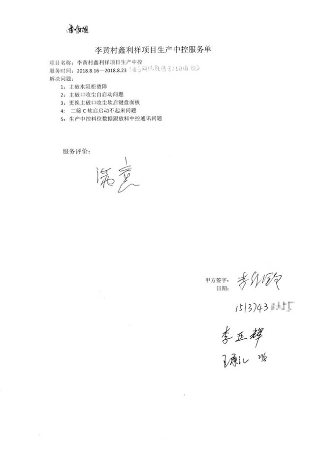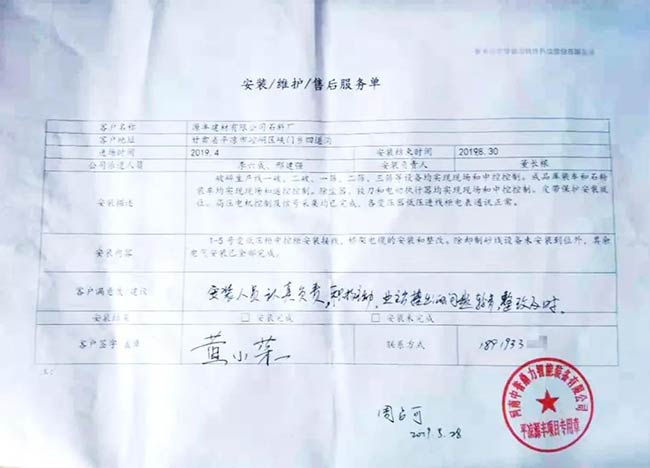 與客戶打交道的過(guò)程,不僅有電氣成套設(shè)備、低壓配電柜、礦山骨料生產(chǎn)線的管理軟件的安裝調(diào)試,還有監(jiān)控設(shè)備工程、電氣工程的施工等等。咨詢,設(shè)計(jì),施工,調(diào)試,維護(hù),培訓(xùn)……如何做到每一個(gè)環(huán)節(jié)都精益求精,達(dá)到客戶要求?完善的質(zhì)量管控和服務(wù)體系不可少。而“項(xiàng)目服務(wù)單”就是其中一項(xiàng)重要措施,記載并參與了服務(wù)的過(guò)程。