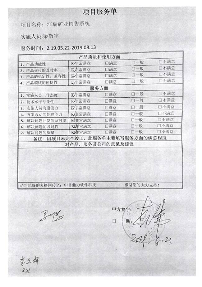 在中譽(yù)鼎力軟件科技股份有限公司,有一張“項(xiàng)目服務(wù)單”。這薄薄的一頁(yè)紙,記載了中譽(yù)鼎力員工去客戶現(xiàn)場(chǎng)進(jìn)行智能礦山管理系統(tǒng)安裝、維護(hù)、售后、問(wèn)題解決等各項(xiàng)細(xì)節(jié);也是中譽(yù)鼎力員工精細(xì)的施工品質(zhì)、完善規(guī)范的管控機(jī)制,以及追求客戶滿意的服務(wù)理念的真實(shí)寫照。