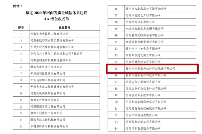 近日,新鄉(xiāng)市中譽鼎力軟件科技股份有限公司通過初審、用戶滿意度調(diào)查、評估等程序,成功入選“2020年河南省質(zhì)量誠信體系建設AA級企業(yè)”名單。