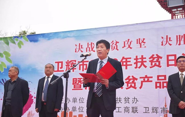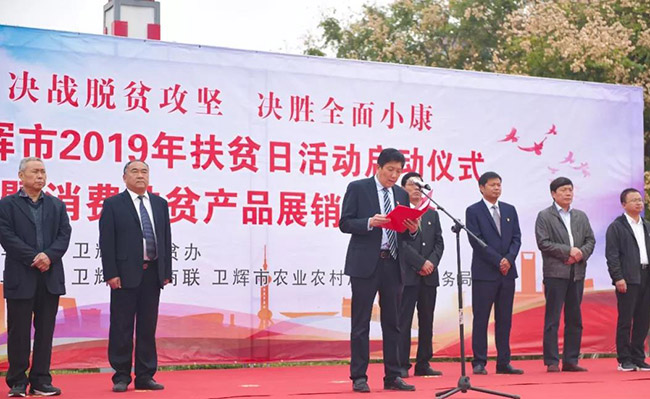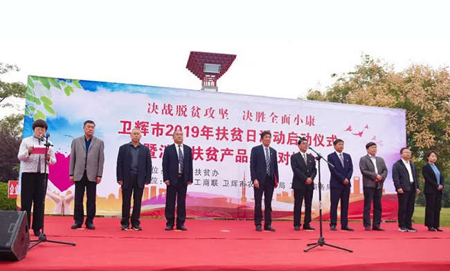 2019年10月17日是我第六個扶貧日。為營造人人關心扶貧、人人支持扶貧、人人參與扶貧的社會氛圍,上午,由衛(wèi)輝市扶貧辦主辦,衛(wèi)輝市工商聯(lián)、衛(wèi)輝市農業(yè)農村局、衛(wèi)輝市商務局協(xié)辦的衛(wèi)輝市2019年扶貧日活動啟動儀式暨消費扶貧產品展銷對接會在衛(wèi)輝市廣場隆重舉行,衛(wèi)輝市委書記梁常運、市政協(xié)主席田貞等四大班子導及衛(wèi)輝市企業(yè)代表出席會議。