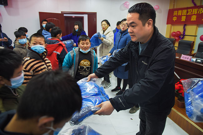 河南中譽鼎力智能裝備有限公司常務(wù)副總張志宇為學(xué)生分發(fā)棉衣