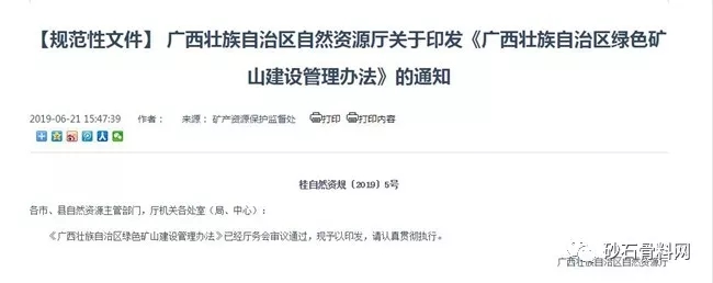 2019年6月17日,廣西壯族自治區(qū)自然資源廳印發(fā)《廣西壯族自治區(qū)綠色礦山建設(shè)管理辦法》(簡稱《辦法》),這意味著廣西綠色砂石礦山建設(shè)有了詳細(xì)的考核。以下內(nèi)容整理由砂石骨料網(wǎng)整理。