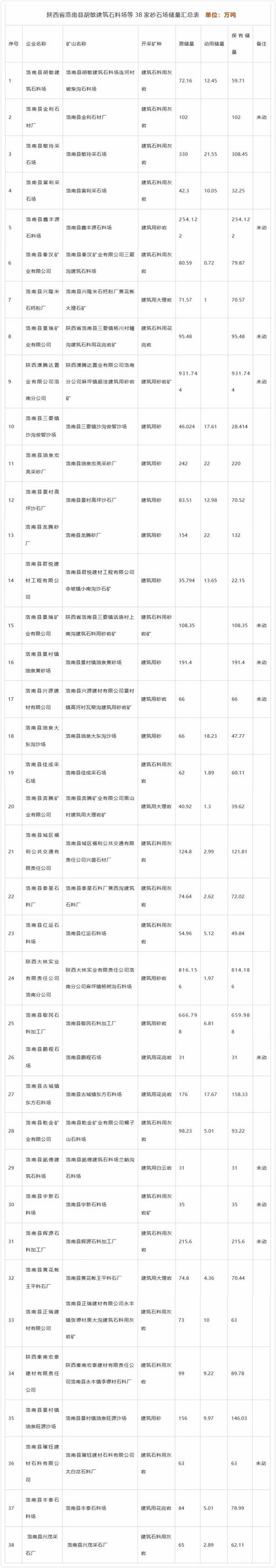 2019年9月4日,陜西省商洛市洛南縣發(fā)布《關(guān)于洛南縣礦山儲(chǔ)量的公示》以下簡稱(《公示》),《公示》對(duì)陜西省洛南縣胡敏建筑石料場等38家砂石場儲(chǔ)量匯總。