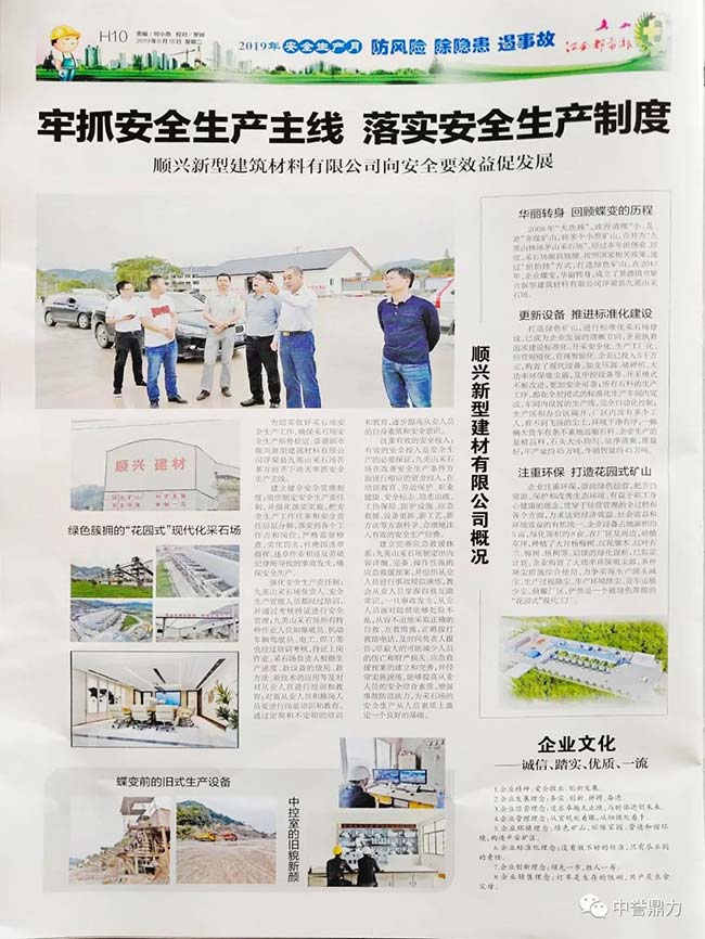 近日,中譽(yù)鼎力EPC承建的江西省景德鎮(zhèn)市順興建筑材料有限公司九英山采石場骨料生產(chǎn)項(xiàng)目因安生產(chǎn)工作突出,被當(dāng)?shù)孛襟w登報(bào)予以宣傳!