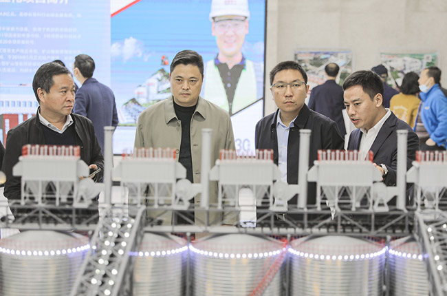 然后,考察團一行前往中譽鼎力投資建設的多位一體循環(huán)建材產業(yè)園項目——衛(wèi)輝市藍天環(huán)保材料有限公司“四位一體”大型建材項目實地參觀。參觀期間,考察團成員不僅對該項目所具備的綠色、智能、集約、等優(yōu)勢有了進一步認識,并在生產現(xiàn)場一睹中譽鼎力履帶式錘破移動破碎站的風采。