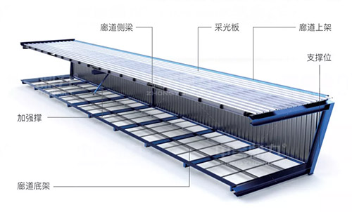 組裝式廊道采用模塊化設(shè)計(jì),分體式加工,整體由廊道底架、廊道上架、廊道側(cè)梁、采光板、支撐位、加強(qiáng)撐等部位組成,不同部位運(yùn)輸?shù)巾?xiàng)目現(xiàn)場(chǎng)進(jìn)行組裝,可以大幅度縮短項(xiàng)目建設(shè)周期,同時(shí)減少建設(shè)成本。