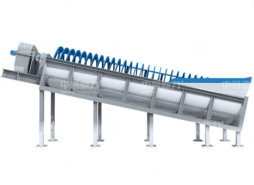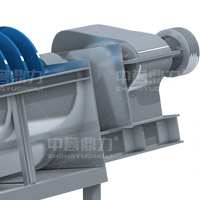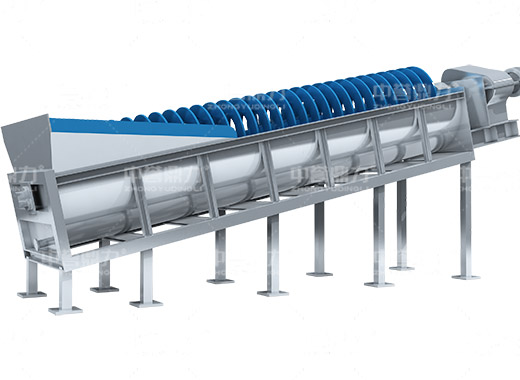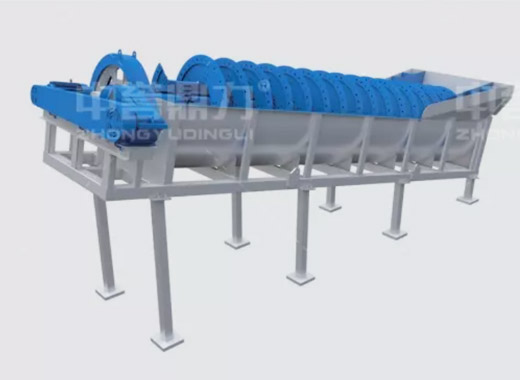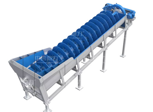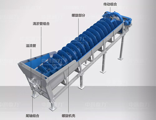 電動機帶動螺旋開始轉(zhuǎn)動,砂石進(jìn)入到水洗槽中,在螺旋葉片的帶動下翻轉(zhuǎn),砂石快速的與水?dāng)嚢枞诤,使物料中的泥土等雜質(zhì)與砂分離,清洗掉的雜質(zhì)隨著溢流管流出,清洗干凈的砂石在螺旋葉片的帶動下,推到高出的出料口排出水洗槽,完成砂石清潔。
