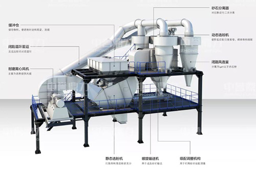 從選粉樓內(nèi)部結(jié)構(gòu)圖可以看到,設(shè)備主要由緩沖倉、動(dòng)態(tài)選粉機(jī)、靜態(tài)選粉機(jī)、風(fēng)機(jī)、循環(huán)管道、風(fēng)選室、砂石分離器、螺旋輸送機(jī)、級(jí)配調(diào)節(jié)裝置等部分組成。