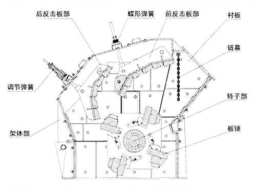 DLHCS反擊式破碎機(jī)主要運(yùn)用沖擊能的破碎原理,轉(zhuǎn)子在電機(jī)帶動(dòng)下高速旋轉(zhuǎn),物料進(jìn)入機(jī)腔后落入板錘工作區(qū),板錘在轉(zhuǎn)子的帶動(dòng)下飛速旋轉(zhuǎn),撞擊物料破碎,而后物料又被拋向機(jī)腔內(nèi)壁的反擊襯板,后被反彈到板錘,與此同時(shí),物料在機(jī)腔內(nèi)互相碰撞,經(jīng)多次破碎后達(dá)到成品料要求的物料從出料口排出。