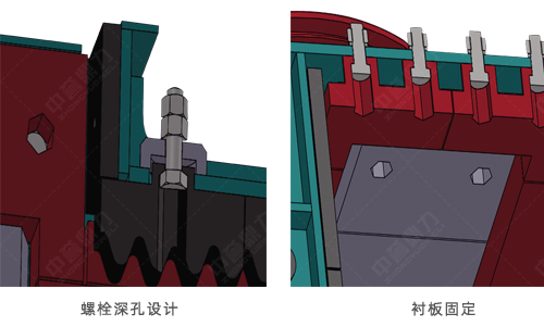 該系列機(jī)型采用六角頭高強(qiáng)螺栓固定主襯板、側(cè)襯板,螺栓頭部沉孔為深孔型設(shè)計,防止由于破碎原材料小而磨損螺栓頭部
