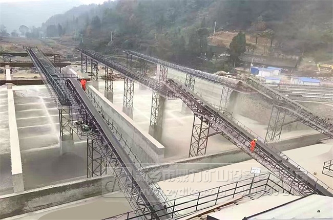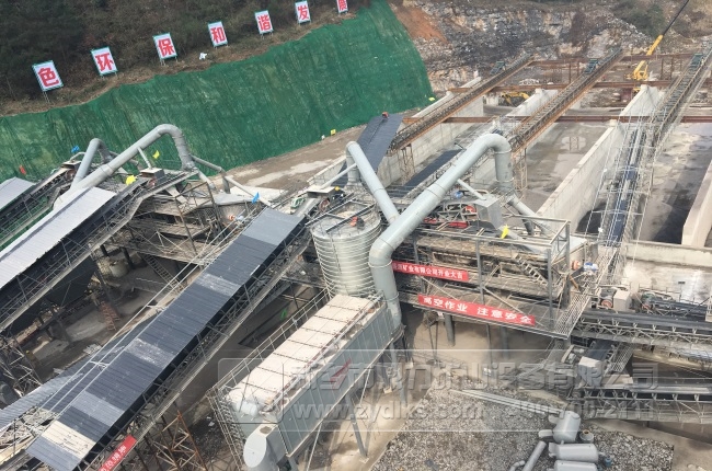 上圖為貴州遵義同興源建材時產(chǎn)1000噸骨料生產(chǎn)線生產(chǎn)現(xiàn)場,排列整齊的皮帶輸送帶有序的運送骨料,在一些皮帶輸送機密集的區(qū)域,設(shè)置了脈沖袋式除塵器,也是由中譽鼎力研發(fā)的,將設(shè)備安裝在基臺上方,占地面積小,節(jié)省基建投資。