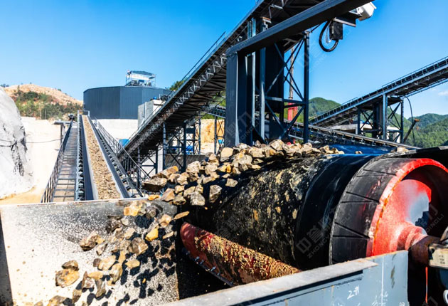 · 原礦初破:自卸車運至堆場→DLPCZ1820錘破粗碎→封閉廊道(400m)輸送至加工區(qū)中轉(zhuǎn)倉