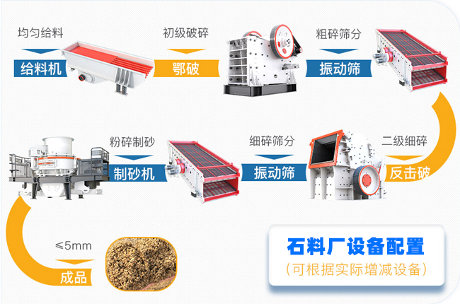 一般制砂生產(chǎn)線需要用到給料機、破碎機、篩分機、制砂機、輸送機、洗砂機等。依照不同用戶的原料、產(chǎn)能、出料、場地、預(yù)算等不同,以下就沖擊式制砂機成套設(shè)備中的主要設(shè)備進行介紹: