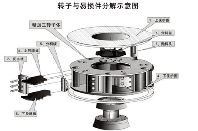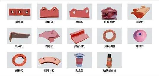 沖擊破制砂機(jī)易損件共有15個(gè):上/下軸套(進(jìn)料斗部位)、減震橡膠、甩輪護(hù)口圈、上∕下流道板、沖擊塊、分料錐、板、拋料頭、下料襯環(huán)、進(jìn)料管、上∕下?lián)舸蜃o(hù)板、料斗襯環(huán)、分料盤、散料盤、周護(hù)板等。
