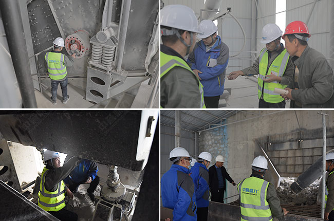 在現(xiàn)場,售后服務(wù)團(tuán)隊(duì)各司其責(zé),分別對這條時(shí)產(chǎn)1500噸砂石生產(chǎn)線的給料機(jī)、破碎機(jī)、制砂機(jī)、振動(dòng)篩、減速機(jī)、輸送設(shè)備、散裝機(jī)、除塵設(shè)備、拉鏈機(jī)、電氣設(shè)備等進(jìn)行細(xì)致檢查,并做詳細(xì)記錄。同時(shí)也向項(xiàng)目相關(guān)負(fù)責(zé)人就設(shè)備的日常使用保養(yǎng)、注意事項(xiàng)提出了建議。