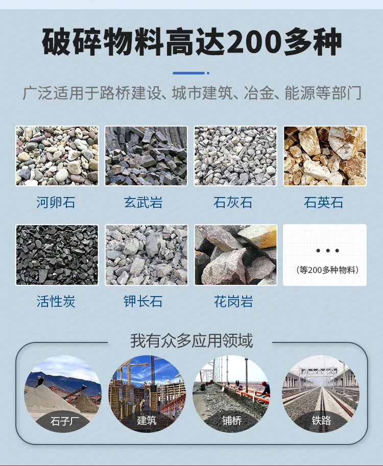 適應(yīng)物料:鐵礦石、銅礦石、石灰石、花崗巖,玄武巖,輝綠巖、頁巖、石英石、河卵石