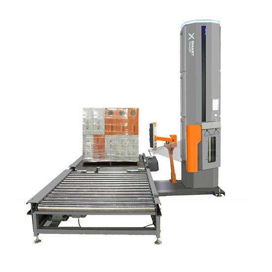 轉(zhuǎn)臺式在線纏繞機一般采用熱式斷膜,即通過對加熱絲進行瞬時加熱完成斷膜,這種斷膜的好處是切口平整,再通過一個撫膜臂可以將尾膜固定在貨物上不會脫落。